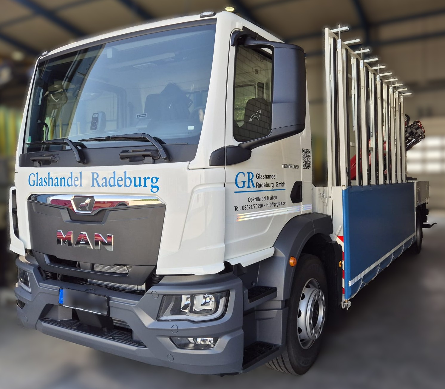 In unserem Fuhrpark stehen verschiedene LKW-Größen mit Glastransportreff und Kran zur Verfügung um für jegliche Baustellensituation gewappnet zu sein.